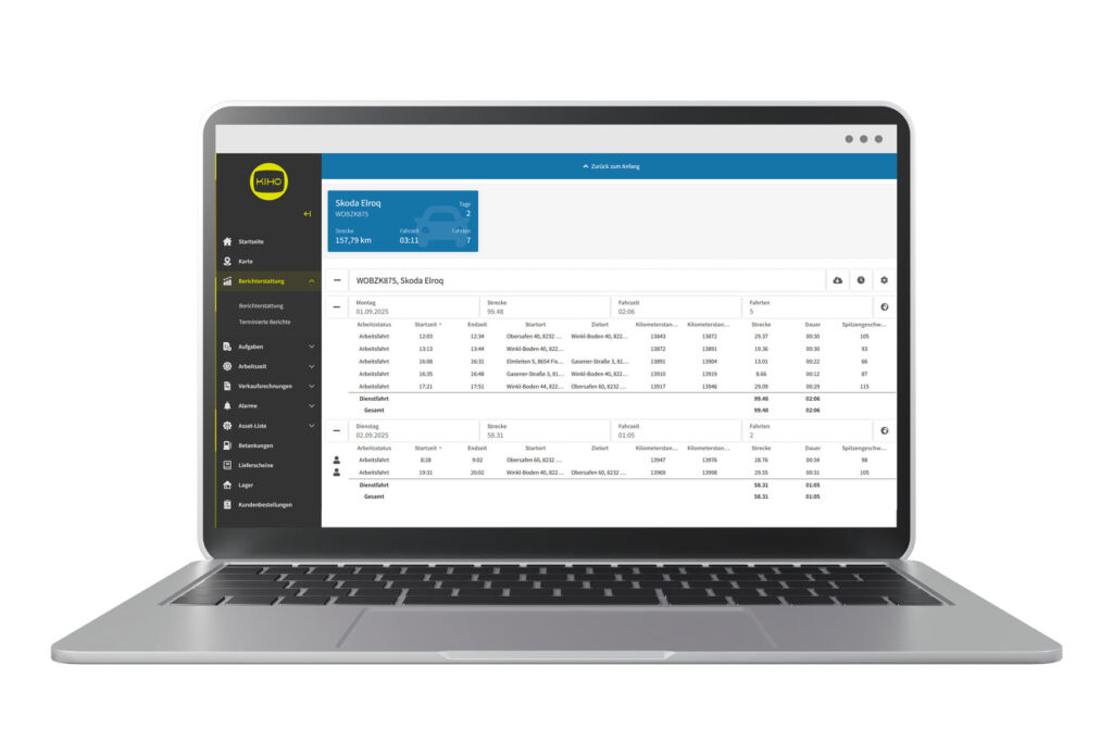 - Dank intelligenter Erkennung erkennt Kiho, welche Fahrten geschäftlich und welche privat sind – zuverlässig und datenschutzkonform.