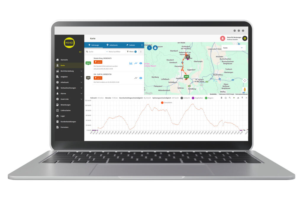 Hinweis: Fahrten und Routen lassen sich auf der Karte oder in Diagrammen einsehen; Echtzeit-Positionen sind mit aktivierter Telematik verfügbar.